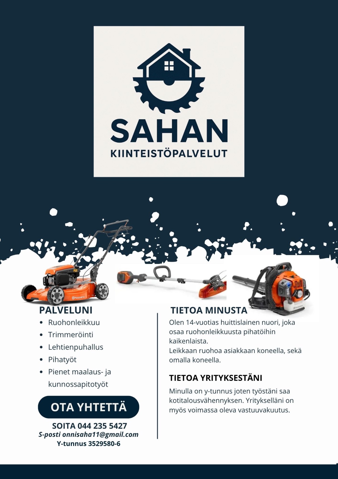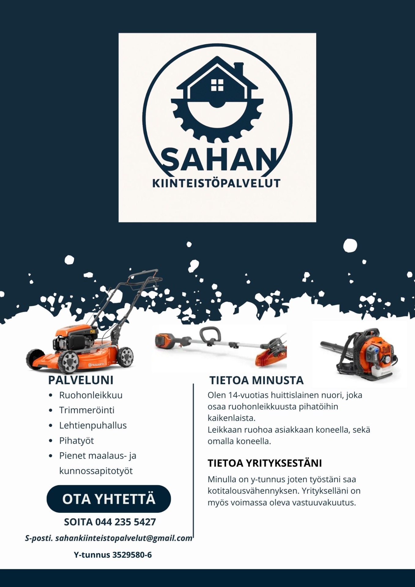 Sahan kiinteistöpalvelut tarjoaa luotettavaa ja ammattitaitoista pihojen hoitoa Huittisten alueella. Palveluihimme kuuluvat muun muassa nurmikon leikkaus ja puutarhan hoito. Luomme viihtyisän ja hoidetun ympäristön kiinteistöllesi.